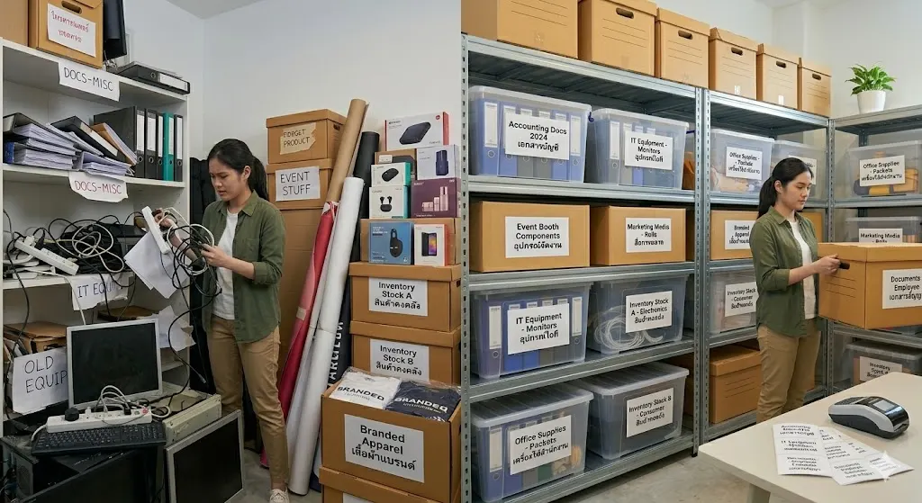ปัญหาที่หลายองค์กรมักมองข้ามคือ การเก็บ Asset เหล่านี้ปะปนกันโดยไม่มีการจัดระบบที่ชัดเจน เช่น เอกสารสำคัญถูกวางรวมกับอุปกรณ์ทั่วไป หรือสินค้าถูกเก็บร่วมกับของใช้สำนักงาน สิ่งเหล่านี้ไม่เพียงทำให้ห้องทำงานดูรก แต่ยังเพิ่มความเสี่ยงต่อการสูญหาย เสียหาย หรือค้นหาไม่เจอในเวลาที่ต้องการใช้งานจริง
