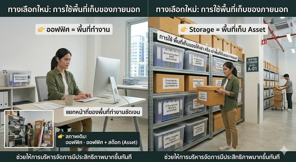 แทนที่จะรวมทุกอย่างไว้ในออฟฟิศเดียว ธุรกิจสามารถแบ่งบทบาทของพื้นที่ออกได้อย่างเป็นระบบ โดยให้ออฟฟิศเป็นพื้นที่สำหรับการทำงาน การประชุม และการสร้างสรรค์ไอเดีย ส่วนพื้นที่ Storage จะถูกใช้สำหรับเก็บ Asset เช่น สต็อกสินค้า เอกสาร หรืออุปกรณ์ต่าง ๆ