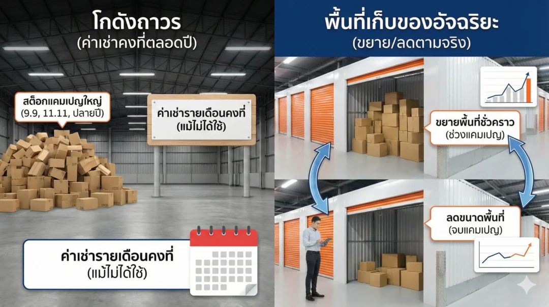 ร้านค้าออนไลน์ขนาดเล็ก–กลางที่ขายสินค้าแฟชั่น อาจมีสต็อกจำนวนมากในช่วงก่อนเทศกาล เช่น ปีใหม่หรือช่วงแคมเปญลดราคา หากเลือกเช่าโกดังขนาดใหญ่ตลอดทั้งปี ร้านค้าจะต้องจ่ายค่าเช่าเต็มจำนวน แม้ในช่วงที่สต็อกเหลือเพียงเล็กน้อย