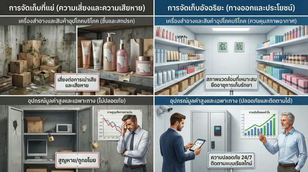 ธุรกิจขายเครื่องสำอางหรือสินค้าอุปโภคบริโภค หากเก็บสินค้าไว้ในพื้นที่ที่อับชื้นหรือไม่มีการควบคุมความสะอาด อาจทำให้บรรจุภัณฑ์เสียหาย ฉลากหลุด หรือสินค้าเสื่อมคุณภาพก่อนถึงมือลูกค้า ส่งผลให้ต้องรับภาระคืนสินค้าและเสียความน่าเชื่อถือของแบรนด์