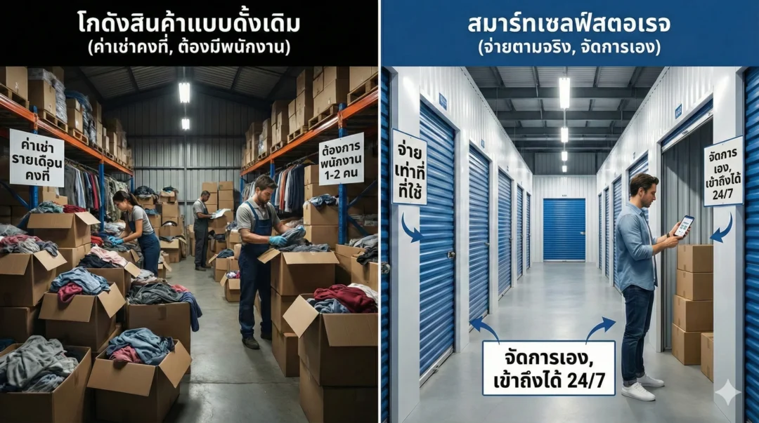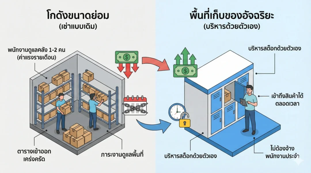 ในทางตรงกันข้าม การเช่าพื้นที่เก็บของอัจฉริยะช่วยให้ผู้ประกอบการสามารถ จ่ายเฉพาะพื้นที่ที่ใช้งานจริง เลือกขนาดห้องเก็บของให้เหมาะสมกับปริมาณสินค้าในแต่ละช่วงเวลา ไม่จำเป็นต้องเช่าพื้นที่ขนาดใหญ่เกินความจำเป็น และไม่ต้องลงทุนล่วงหน้าเป็นเงินก้อน