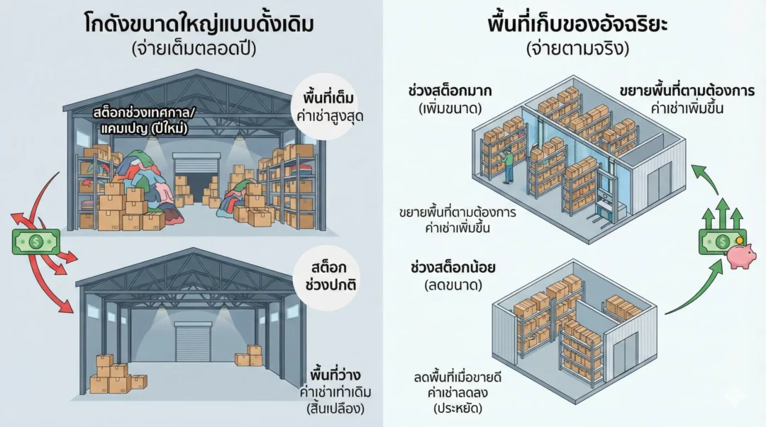 การเติบโตของธุรกิจในความเป็นจริงไม่ได้เป็นเส้นตรง บางช่วงยอดขายเพิ่มขึ้นอย่างรวดเร็ว ทำให้ต้องมีสต็อกสินค้าเพิ่ม แต่บางช่วงกลับต้องควบคุมต้นทุน ลดสต็อก หรือชะลอการลงทุน การผูกสัญญาเช่าคลังสินค้าระยะยาวจึงอาจกลายเป็นภาระทางการเงินมากกว่าข้อได้เปรียบ