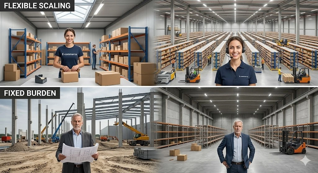 ข้อดีคือคุณสามารถตอบสนองต่อสถานการณ์ได้เร็ว เช่น ธุรกิจออนไลน์ที่มียอดออเดอร์เพิ่มขึ้นแบบก้าวกระโดด หากต้องรอสร้างโกดัง อาจจัดการสินค้าไม่ทัน แต่ถ้าเช่าพื้นที่ ก็สามารถย้ายสต็อกเข้าไปจัดการได้ทันที ทำให้การแพ็คและจัดส่งยังคงต่อเนื่อง