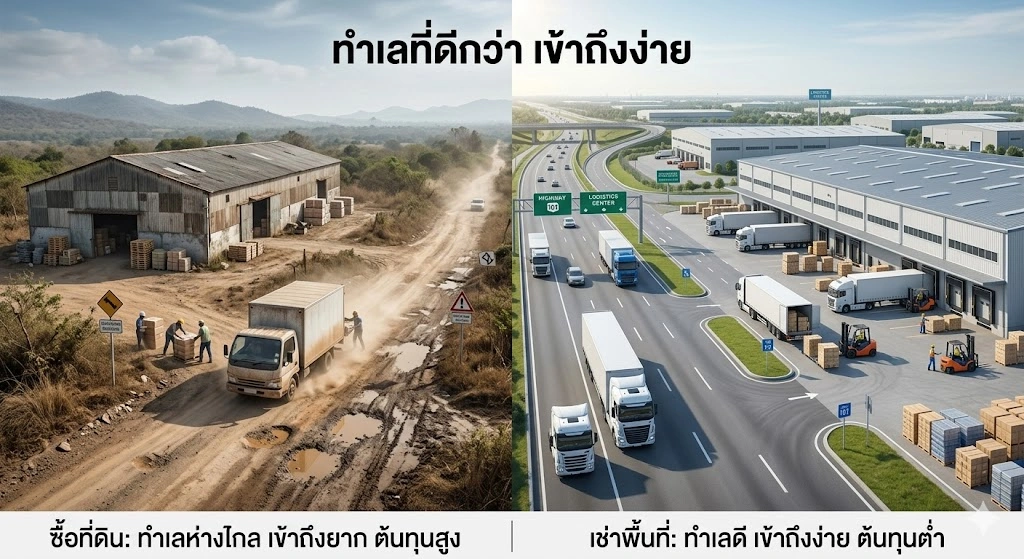ทำเลเป็นปัจจัยสำคัญที่ส่งผลต่อประสิทธิภาพในการดำเนินธุรกิจโดยตรง แต่ในความเป็นจริง “ทำเลดีมักมาพร้อมต้นทุนที่สูง” โดยเฉพาะหากต้องซื้อที่ดินหรือสร้างโกดังเองในพื้นที่ที่เข้าถึงง่าย