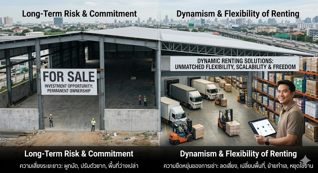 การลดความเสี่ยงในระยะยาว เป็นอีกเหตุผลสำคัญที่ทำให้หลายคนเลือก “เช่า” แทนการลงทุนซื้อหรือสร้างโกดังเอง เพราะการลงทุนในอสังหาริมทรัพย์มักมีความไม่แน่นอนแฝงอยู่เสมอ